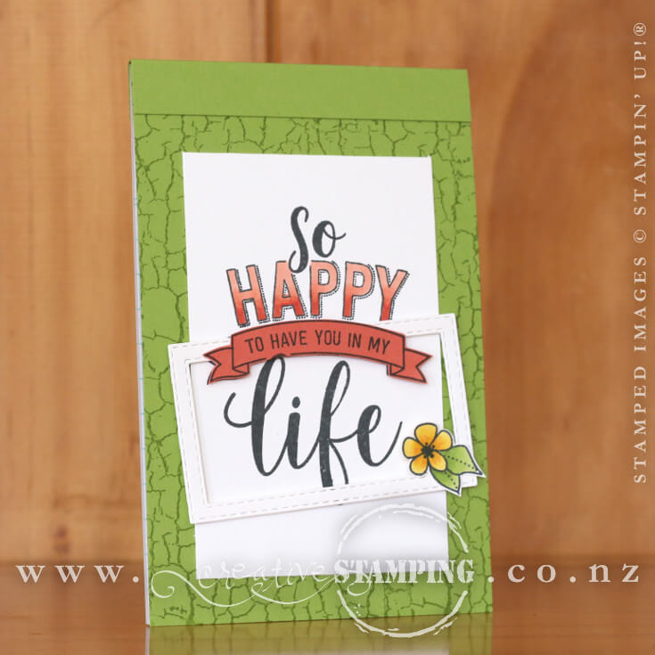 I love dollar-store notepads. They are inexpensive to purchase, fun to cover and decorate, and a simple gift that is great to give and small enough to easily post. Or you could personalise it for your own desk! This notepad uses the fabulously eclectic Amazing Life stamp set on the cover, coloured with Calypso Coral, Daffodil Delight, and Granny Apple Green Stampin' Blends...