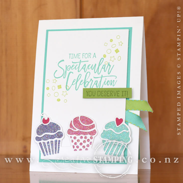 This birthday card has a bunch of fun techniques and a whole lot of wow-factor! I used the Birthday Cheer stamp set to stamp the words and confetti on the card front, and the coordinating Detailed Birthday Edgelits Dies to create a sparkly cupcake border...