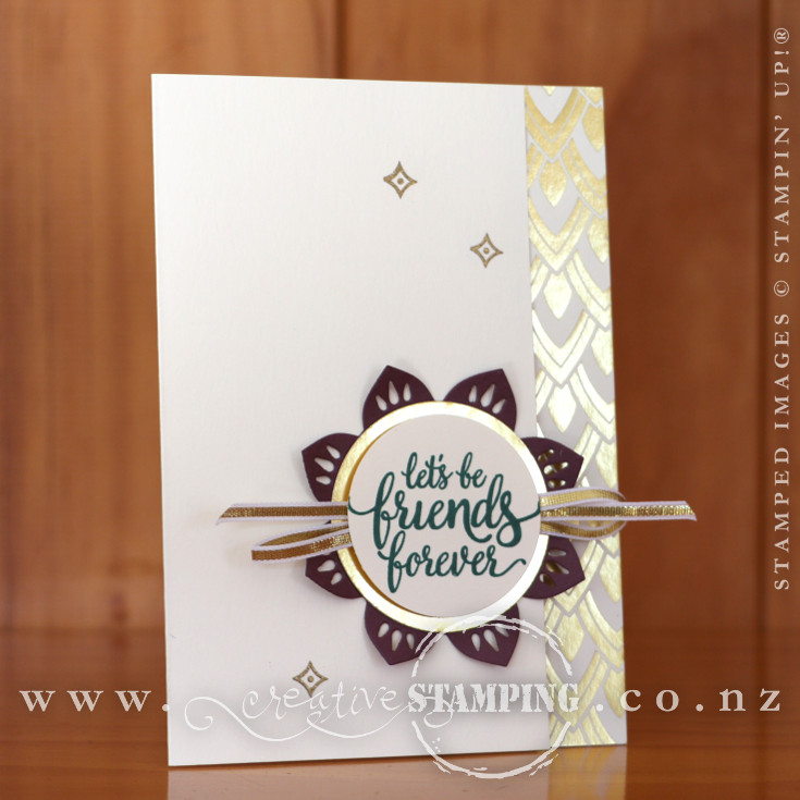 The Eastern Beauty stamp set and Eastern Medallions Thinlits Dies are perfect partners! Not only are there lots of symmetrical, mosaic-inspired stamps that work together (like the five-petal medallion and pretty heart-shaped scroll on this card) but the dies coordinate so well with the stamped images to fully or partially cut out the oriental designs.