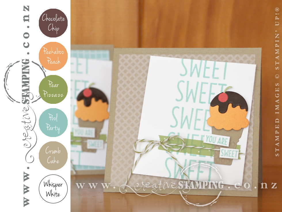 Word stamps can be used for more than just adding sentiments. Stamping words repeatedly in a haphazard- or linear-style is a great way to create an interesting background or a focal point for your project. For this thank you card, I've stamped "SWEET" from the Cool Treats stamp set down my card and then highlighted the word again in the "YOU ARE SWEET" sentiment. The Cool Treats stamp set is paired with some of the other delicious products in the Cool Treats Suite, like the Frozen Treats Framelits, Tasty Treats Designer Washi Tape and the Tasty Treats Specialty Designer Series Paper...