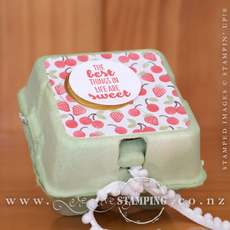 I hope you're having a fabulous Easter! At my monthly workshops, I shared an idea for creating a gift box for Mother's Day, which is a Mini Egg Carton filled with pamper products. The one I showed my guests was just a prototype and wasn't decorated, but now it is! I spritzed the Mini Egg Carton with Pear Pizzazz ink and finished it with the Tasty Treats Specialty Designer Series Paper...