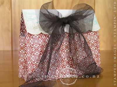 A couple of weeks ago we made designer paper gift bags at a Crafters Anonymous online class, taught by the lovely Dee Sturgeon. I made a Christmas one using the Be of Good Cheer DSP and gave it away in the prize draw at the Hamilton Christmas Extravaganza. The other one I made I used the striking Cajun Craze patterned paper from the Comfort Cafe DSP pack and finished it with an Early Espresso scalloped tulle bow (page 4, Holiday Catalogue)...