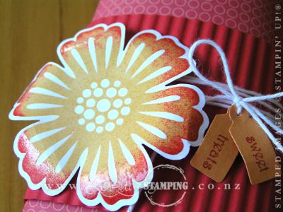 This was one of the projects we made at the all-day Crafter Anonymous fundraiser - a pull-up treat holder taught by Juila Leece. This project wonderfully showcases Stampin' Up!'s fabulous designer paper and the Mixed Bunch stamp set from the Autumn-Winter Mini...