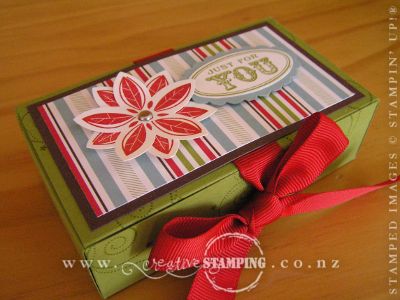 Yesterday we had the Hamilton Extravaganza. We got close to 100 stampers on the day and everyone who attended had a great time. How our extravaganzas work is, five pairs of demonstrators prepared and taught a project, moving from table to table so at the end of the day everyone who attended took home five lovely creations. I was fortunate to be paired up with Rachael, a very creative demonstrator from Auckland. She came up with this lovely box, which is what we demonstrated on the day.