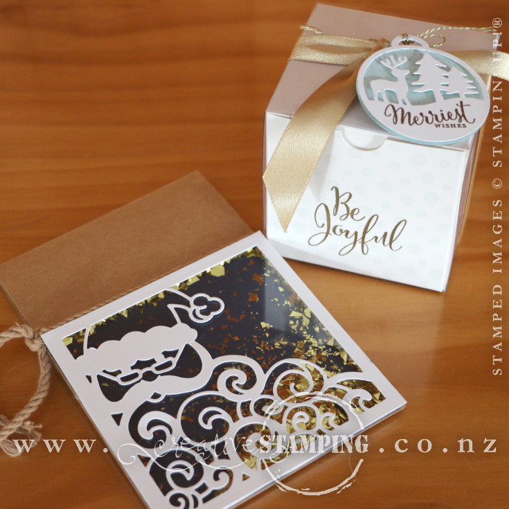 The intricate cutout from the Detailed Santa Thinits is perfect for shaker cards, and Mica Flakes make perfect shaker pieces - the gold mica flakes look a-ma-zing when they move! Here's the front of my Christmas card...