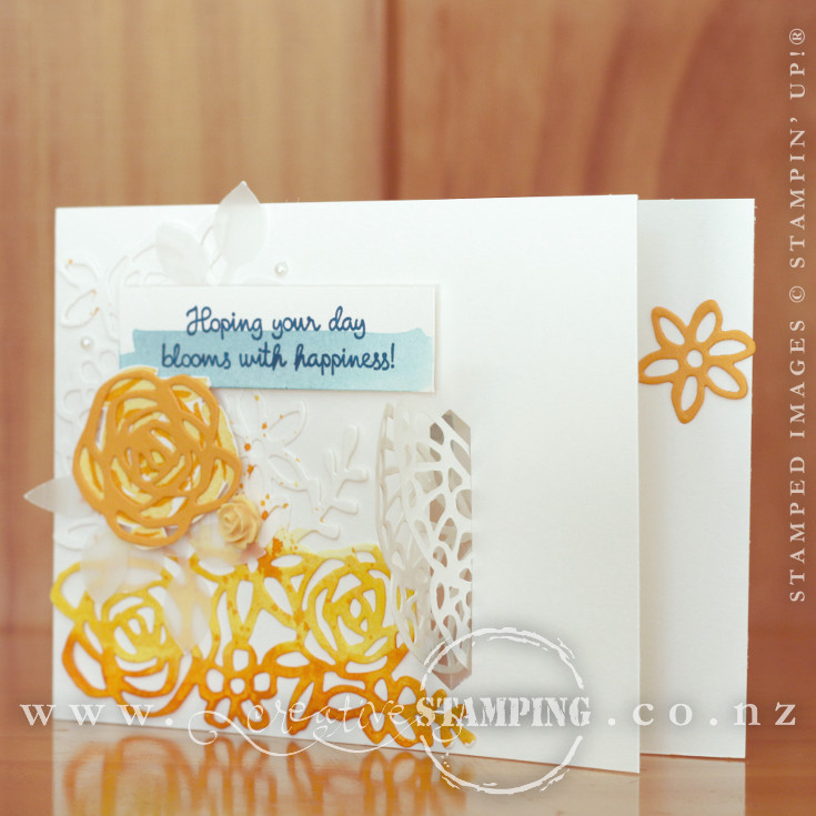 This gorgeous butterfly card uses the Abstract Impressions stamp set and coordinating Springtime Impressions Thinlits Dies, and is a happy meld between the similar Soft Sea Foam Sympathy card with colours and design elements drawn from the Lustrous White Mini Gable Box I shared in June. Unlike the Sympathy Card, which the butterfly is the focal point, this gorgeous birthday card puts the focus on the beautiful die-cut flowers...