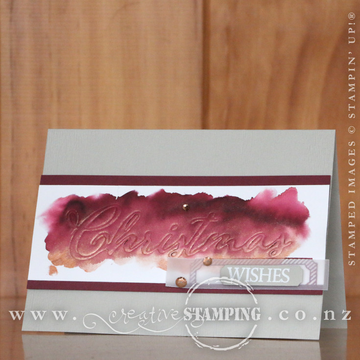 I am inspired by the colours in the Joyous Noel Specialty Designer Series Paper - it has a vintage-vibe, but with fresh, new colours. This Christmas card may not have any of that designer paper, but the colours are drawn from it... Sahara Sand, Merry Merlot, and copper. I've combined these gorgeous colours with one of my favourite bundles in the Holiday Catalogue, the Merry Christmas To All stamp set and coordinating Merry Christmas Thinlits Dies.