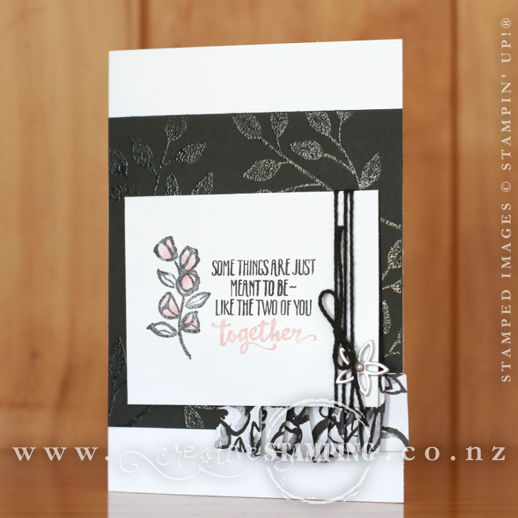 The Petal Passion Suite from the new Occasions Catalogue is a very pretty set of items that have gorgeous brushstroke imagery. The images from nature in these coordinating products have lovely watercolour effects in black and white and also lend themselves to many colouring options. This Valentine, Wedding or Anniversary Card was created using the Petal Palette stamp set, Petal Passion Designer Series Paper and Petal Passion Embellishments, and breaks the black-and-white imagery with a touch of pink...