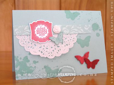 I was inspired by the lovely spring weather and this month's promotion to create this card using the Papillon Potpourri stamp set and coordinating Bitty Butterfly punch...