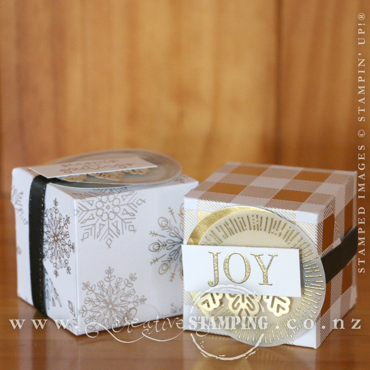 I used the gorgeous Year of Cheer Specialty Designer Series Paper and Caroline's Diagonal Opening Gift Box design to create these lovely Christmas boxes in gold and silver. These sweet gift boxes are 2" square and look like something small, blingy, and expensive is inside!